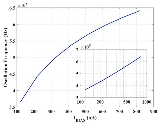 Figure 9 shows the oscillation frequency as a function of biasing current (Ci = 10 fF). An oscillation range from 360 MHz to 640 MHz is found with tuning sensitivity, i.e., the ratio between (fMAX − fMIN)/(IBIAS,MAX − IBIAS,MIN), about equal to 0.43 MHz/nA. Compared with the predicted behavior (linear relationships resulting from (14) and (15)), the obtained one shows a logarithmic relationship with IBIAS. This is confirmed by the inset plot in the same figure, the x-axis of which is logarithmic and slightly extended to cover an entire decade. Such changing in the behavior may be due to the partial operation in moderate inversion region, where subthreshold equations lose accuracy.