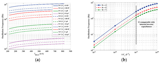 Figure 10a,b shows oscillation frequency with number of stages N equal to 3, 5, and 7 and for different coarse tuning capacitances, Ci, in the considered current biasing range (Figure 10a) and for a fixed IBIAS = 320 nA (Figure 10b) at T = 30 °C. It is apparent that frequency varies with the bias current, independently of the number of stages and coarse tuning capacitance. Constant spacing between two adjacent curves shows that the number of stages N acts as a scaling constant factor in the expression of the frequency, as predicted by (14) or, equivalently, (15). Moreover, Figure 10b highlights that the coarse tuning capacitance is comparable, in the range between 10 fF and 100 fF, with the parasitic inverter capacitances, being the oscillation frequency to capacitance relation compressed in this range.