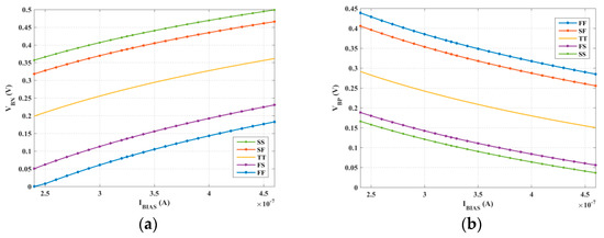 At this purpose, corner analyses were carried out for the 5-stage topology as an illustrative example. Figure 11 shows the two bulk-source voltages VBN and VBP as a function of IBIAS, at 30 °C. It is apparent that to ensure correct operation (i.e., to maintain bulk voltages within the supply limits) biasing current range must be limited from 240 nA to 460 nA.