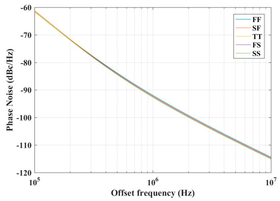 Phase noise versus offset frequency (Δf) for the basic corners is illustrated in Figure 13, which clearly shows the close overlap of the five curves, indicating that also the phase noise is process independent.