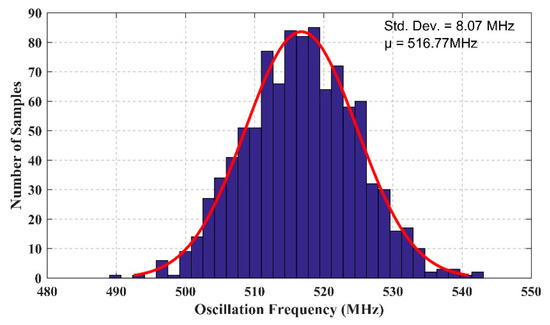 Mismatch Monte Carlo simulations of the oscillation frequency in typical conditions (VDD = 0.5 V, IBIAS = 350 nA and T = 27 °C) are reported in Figure 14, showing the limited impact of mismatches on the oscillation frequency of the proposed CRO.