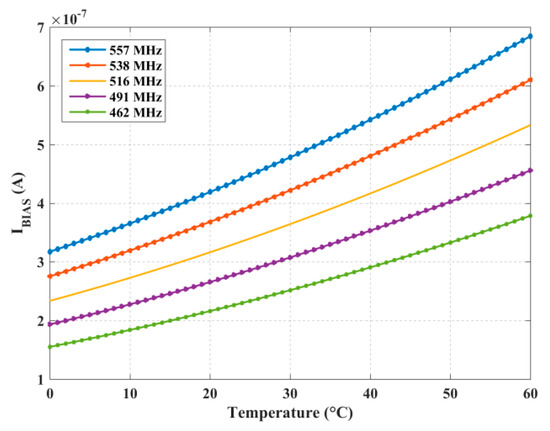 As already mentioned, the tuning capabilities of the proposed CRO can be exploited to compensate for the effects of temperature variations (in a non-exclusive alternative to process variations). To give an example, Figure 15 shows some isofrequency curves (at 557 MHz, 538 MHz, 516 MHz, 491 MHz, and 462 MHz) in IBIAS vs. temperature plot. Each point of the curves establishes the current IBIAS needed to set the target frequency between around 450 MHz and 557 MHz in the operating range from 0 °C to 60 °C.