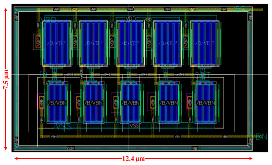 The layout of the five stage CRO is reported in Figure 17, showing an area footprint of 12.4 μm × 7.5 μm. To better assess the reliability of the above results, post layout simulations have been carried. The main effect of the layout resulted in a parasitic capacitance of 6.5 fF at the output node of the CRO. Once reduced the explicit coarse tuning capacitance of an amount equal to the parasitic capacitance, post layout simulations resulted to be in very good agreement with schematic level simulations.