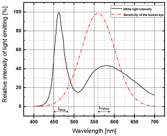 As per [3], the White LED journey started after discovering the blue LED by Shuji Nakamure in Japan. The first white light source was developed by mixing lights from red, green, and blue LEDs together. As this method is deemed to be expensive, the most recent method to produce white light is by adding a phosphorous layer to the blue LED, which modifies the emission spectrum. The blue light excites the phosphorus and allows it to emit yellow light. Combining both yellow and blue lights produces the appearance of white light. Figure 2 shows the relationship between the actual white light spectrum and the human eye’s sensitivity to white light. Unfortunately, unlike red, yellow, and green LEDs, circuit drivers for WLEDs (e.g., InGaN LEDs) are more challenging to develop than conventional LEDs (e.g., GaAs, SiGe). As a result, customized WLED drivers are necessary.
