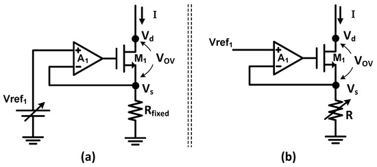 In addition to the aforementioned aspect, the drain voltage in Figure 3a needs to be set to the highest value plus the overdrive () compared to the near fixed value in Figure 3b, as follows the changing reference value (). This clearly demonstrates that the circuit depicted in Figure 3a is more power-efficient than Figure 3b. Therefore, the programmable resistor approach is used in this work.