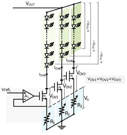 To further investigate the efficiency improvement of the programmable resistor current sink topology, a case of three unmatched WLED strings is considered. Figure 4 shows the three strings, including the current sinks along with the voltage drop across various elements. The voltage drop across each variable resistor () is the same, tracking the reference voltage (). The value of the overdrive voltages (, &) varies because the total voltage drop across the WLEDs in any string varies as the forward voltage drop across each WLED changes.