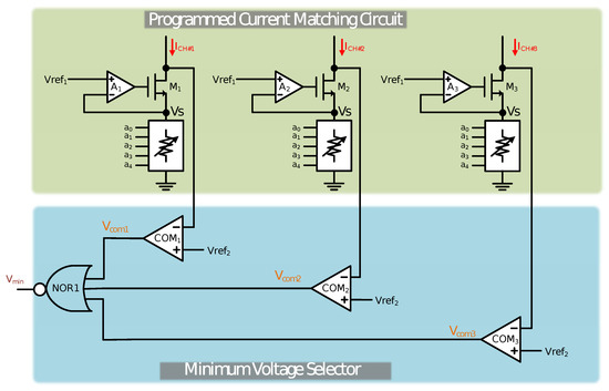 The top part of Figure 5 shows the proposed programmable current matching circuit. This circuit consists of three programmable current sinks, one per string. The current sink comprises a boosting amplifier (), current sink transistor M1, and a digital programable resistor bank. The current sink value is made programmable as the reference voltage () and the programmed resistor values are adjustable. With high gain boosting amplifiers (), the voltage at the source of the transistor should closely equal the reference voltage ; hence, the current value approaches . For this condition to be satisfied, the current sink transistor M1 must operate in the saturation region. To maintain M1 in the saturation region, the drain potential of M1 should be higher than , which is equal to plus the overdrive voltage of M1. Once the drain voltage of M1 reaches the set value , the digital comparator () triggers low. At this point, both the targeted voltage and current values are met.