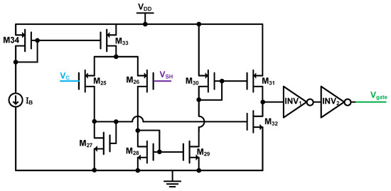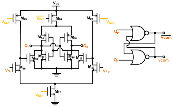 The comparator (COM4) shown in Figure 7 cannot be of a clocked-latch type comparator as the has the same clock signal frequency. Therefore, push-pull output comparator topology is used to design COM4 [28], as shown in Figure 8.