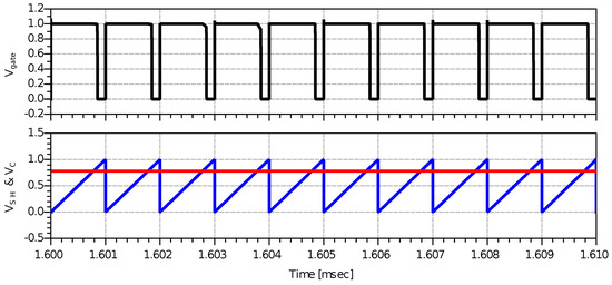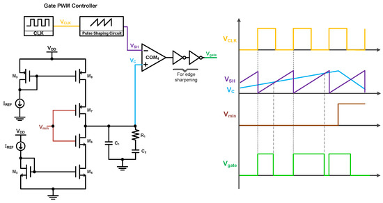 Figure 7 shows the implementation of the compensator and PWM modulator along with the generated waveforms at selected nodes. The charge pump is composed of a current sink (M4) and current source (M8), as well as two switch transistors (M6 and M7). As the switch M7 turns ON, the current source transistor M8 pumps current to the output loop filter (C1, C2, and R), consequently raising its output voltage. The current sink transistor M4 does the opposite when switch M6 turns ON. Since is a binary signal, either the current source or the current sink can be ON at any time. The charge pump integrates the pulses to a continuous output signal . Then, it is compared to the one-sided sawtooth signal generated by the pulse shaping circuit. While the loop filter capacitor (C1) serves as an integrator to help stabilize the system, the R1&C2 branch adds a zero to the compensation circuit to improve the phase margin of the system. The inverters in front of the comparator are used to sharpen the edges of the drive signal. Note that this charge bump and the loop filter combination acts as a type-II compensator in this implementation.