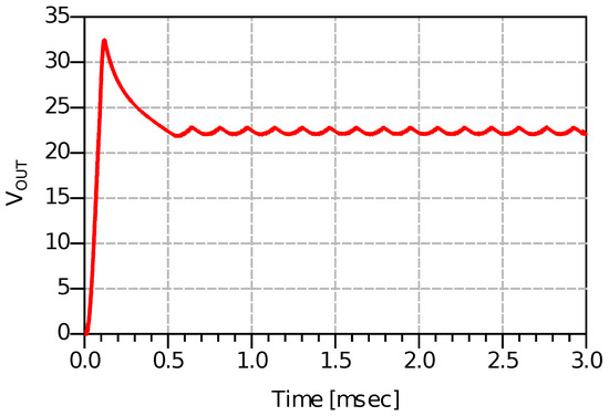 Figure 9 shows the output voltage () waveform of the boost converter. The voltage level is set by the controller based on the minimum current sink overhead (), as shown in Figure 5. This minimum voltage satisfies all the WLEDs in all strings, including the one with the highest combination of (i.e., string #1). The output voltage ripple in a steady-state is a result of the single-bit feedback controller presented at the output of the NOR gate. This ripple has no effect on the current accuracy of the individual string due to the proposed current sink topology. In this current sink, the current is a weak function of the drain-source voltage () of the current sink transistor. The string current is mainly set by the voltage reference () that is independent of the output voltage ripple.