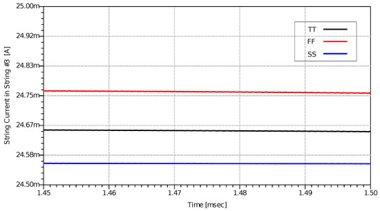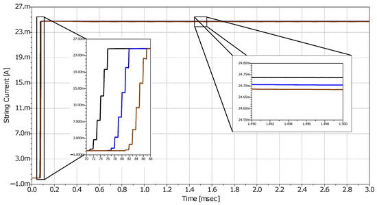 As the targeted minimum output voltage has been reached, all strings are being activated and operational. This is clearly illustrated in Figure 10, where the individual currents in each string have reached their targeted value of 25 mA in a steady state. The zoomed-in region in Figure 10 shows the steady-state current of each string. The error in the steady-state current of string #1 (24.785 mA) is due to the finite gain of the boosting amplifier used in the current sink (i.e., , , and shown in Figure 5). The currents in string #2 and #3 exhibit the same behavior. The total forward voltage drops of the WLED in the string dictate the overdrive voltage of the current sink transistor () of a particular string. Therefore, the higher the overdrive voltage, the higher the string current, as shown in Figure 1 for strings #2. The string current, including the effect of process corner variation ( TT, SS, and FF), is depicted in Figure 11. The results clearly show the minimal effect of process corners on the accuracy of the current value.