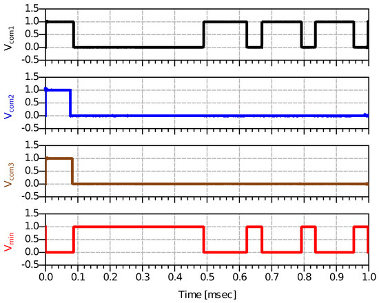 To ensure all strings are active, the sink transistors’ drain voltages should be higher than their respective . Under this condition, the comparators’ outputs are all zero, and, thus, the NOR1 gate output triggers high. So long as the comparator’s output is non-zero, the corresponding string connected to it has not yet activated; thus, the needs to be increased. Consequently, the loop keeps increasing the duty cycle until each comparator’s output reaches zero. The NOR gate logic was selected over NAND gate logic due to its size and speed superiority in CMOS technology [27].