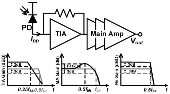 This paper presents a novel inductorless design technique for high-gain optical receiver front-ends. Figure 1 illustrates the operation of the proposed front-end (FE) in contrast to the traditional wideband FE. Conventionally, the transimpedance amplifier (TIA) and the follow-on main amplifier (MA) are designed to have bandwidths in the order of and , respectively, to achieve an overall bandwidth of approximately []. In the proposed receiver, first, the TIA’s bandwidth is reduced to approximately 25 % of the targeted data rate. The reduced TIA bandwidth allows for higher gain, lower input-referred noise, and fewer follow-on gain stages. The reduction in bandwidth also introduces inter-symbol interference (ISI) to the extent that the TIA’s output eye diagram is fully closed. Unlike a bandlimited electrical channel which can introduce more than 30 dB of channel loss at the Nyquist frequency , the low-bandwidth TIA introduces a moderate frequency-dependent attenuation. Consequently, a few dBs of amplitude peaking at fN is sufficient to restore the required bandwidth (for example, the equalizer in [] introduces only 7 dB of peaking). Therefore, in the second step of the proposed design technique, a high-frequency peaking is intentionally introduced in the main amplifier’s amplitude response without impairing its low-frequency gain. Various possible designs of active feedback-based MA architectures [,,,] can introduce the required peaking by adding a pole in their feedback loops. The amplitude peaking in the equalizing main amplifier (EMA) is then used to compensate for the TIA’s limited bandwidth to restore an overall bandwidth of approximately . Although Figure 1 shows only the magnitude response of the TIA and EMA, group-delay variation must also be considered.
