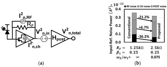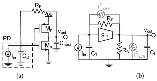 Figure 10a shows the model used for noise analysis. The main noise sources in the Inv-TIA are the channel and feedback thermal noise, shown in Figure 2 and Figure 10 as and , respectively. The power spectral densities of these two sources can be expressed as: and where is the Boltzmann constant, is the temperature in Kelvin, and is the excess noise factor. Under a constant gain-bandwidth product constraint, the noise-optimum FET size is []. Therefore, the transconductance of the TIA’s input device can be calculated as , where is the technology transit frequency at the selected bias point. In Figure 10a, the amplifier following the TIA is modeled by and its input-referred noise PSD is denoted by . is given by (9) and (10) for both the proposed and conventional designs, using and , respectively. In simulations that follow, , , and are fixed at , , and , respectively.