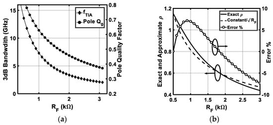 (a) TIA’s 3dB bandwidth and pole as a function of the feedback resistor. (b) The exact and the approximate calculations of as a function of the feedback resistor along with the difference between the two as a percentage error.