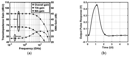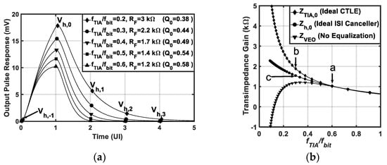 When is reduced far below , severe ISI is introduced to the extent that the output eye diagram is fully closed. Therefore, the DC value of becomes a deceptive measure of the gain. The effective gain must be calculated from the transient response; more precisely, from the pulse response []. The TIA’s pulse response is the response to an isolated binary one transmitted in a long sequence of binary zeros. Assuming a linear time-invariant (LTI) operation, if the TIA’s response to a step input with a peak-to-peak value of is defined as , then its pulse response is calculated as , where UI is the unit interval. The output pulse response of the Inv-TIA is plotted in Figure 4a for a data rate of with and a bandwidth ranging from to . To quantify the ISI, is sampled at the symbol rate relative to its peak (as shown by the marker points in Figure 4a), resulting in a discrete-time sequence given by: