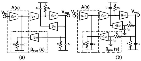 where and are the DC gain and cut-off frequency of the first-order gain cell, respectively. is the DC feedback gain. The transfer function of the overall architecture in Figure 5a is given by: