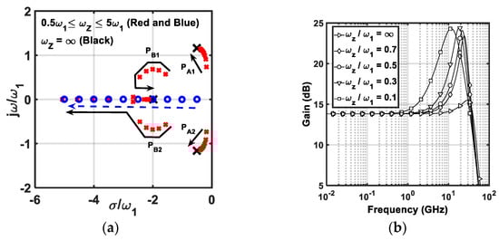 The pole-zero locations of (7) are plotted in Figure 6a in comparison with that of (5) for , , and , fixed at 0.25, , and , respectively. The poles of the conventional architecture are indicated by black x-markers. For the proposed EMA, is swept from to . The insertion of the LPF in the feedback loops of the proposed EMA creates a real zero at (shown in blue). It also increases the order of the denominators of and compared to their conventional counterparts. As a result, for low values of , the proposed EMA has two sets of complex-conjugate poles (shown in red). As increases, travels toward the complex poles of (5) while the damping factor of increases until the two poles become real and start traveling in opposite directions. At sufficiently high , and the real zero cancel each other, reaches the real pole of (5) and the overall architecture degenerates to the third-order gain stage in [].
