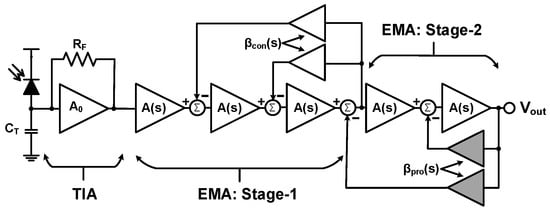 Figure 7 shows the block diagram of the proposed front-end where the limited-bandwidth TIA is followed by a two-stage EMA. The EMA’s second stage is added to relax the gain requirements. The two-stage EMA is modified based on the two-stage MA presented in [] by inserting low pass filters in the feedback loops of the second stage. Therefore, the transfer function of the overall front-end (FE) is given by , where is the transfer function of the two-stage EMA and given by: