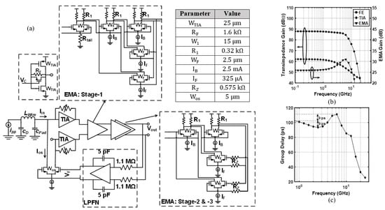 Figure 11a shows the block diagram and the circuitry of the implemented front-end. A replica TIA is used to provide pseudodifferential power-supply noise rejection. The TIA is followed by a three-stage EMA. A series resistor is inserted in the feedback loops of the second and third stages. This resistor, in combination with the parasitic capacitance of the transistor in the feedback loops, creates the zero required for bandwidth extension. Compared to Figure 7, the EMA’s third stage is added to relax the gain requirements and assist in recovering the bandwidth. A low-pass feedback network (LPFN) is connected between the output of the EMA and the input of the TIA. The LPFN amplifies the difference between the DC levels at and returns a feedback voltage of that is then converted to a current by the transconductance of and subtracted from the input current for offset compensation. The LPFN is a single-pole RC filter using a Miller-boosted capacitor and a resistor. A low cut-off frequency of is achieved as a trade-off between the on-chip area and the tolerable baseline wander for long runs of consecutive identical digits. The low common-mode voltage at the TIA’s output prevents the use of a tail current source for the first differential pair in the EMA’s first stage and therefore a poly silicon resistor is used instead.