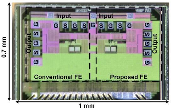 Figure 12 shows the chip layout in TSMC 65 nm CMOS technology. The chip includes two standalone FEs. One FE is the direct implementation of the circuit in Figure 11a while the other is its conventional version (i.e., is replaced by a short circuit). The total size of the chip is . Each front-end is pad limited and occupies , including the I/O RF pads, while the active area, including the offset compensation loop, is about . The high-speed RF input and output probing pads are differential G-S-G-S-G since each FE has differential inputs and outputs. The TIA, the MA/EMA, and the output buffer are powered by different supplies.