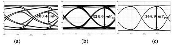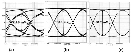 Simulation results for the output eye diagrams when the limited-bandwidth TIA is followed by (a) a wideband MA and (b) the proposed EMA. In (c), the TIA’s bandwidth is widened, and a wideband MA is employed. The input current is fixed at for all simulations.