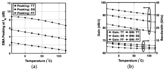 Simulated performance under process and temperature variations: (a) EMA’s peaking at Nyquist frequency; (b) gain and bandwidth of the overall FE.