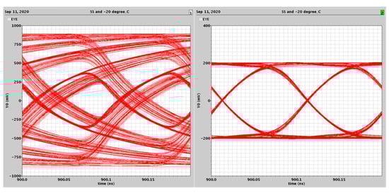 To prove that the proposed technique works despite the PT variations, Figure 15 shows the simulated 10 Gb/s eye diagram at the SS process corner and . The uncompensated eye (left) shows a significant distortion. By carefully adjusting the circuit parameters, a clean eye is obtained (right) with an internal opening similar to that obtained under nominal operations. To generate the eye on the right, the circuit parameters are changed as follows: IB is reduced from 2.5 mA to 1.65 mA, IF is increased from 0.325 mA to 0.4 mA, and RZ is reduced from 0.575 kΩ to 0.445 kΩ. The tunability range of all circuit parameters are limited to less than 35% of their nominal values which is feasible for realization. Further, the capacitance introduced by the configurable current sources appears at tail nodes and therefore does not alter the signal path.