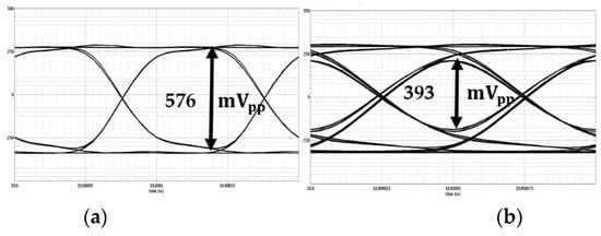 The circuit in Figure 11a is also examined for 20 Gb/s operation with the same simulation setups described in Section 5.1 First, the TIA’s bandwidth is set to 6 GHz (30% of the targeted data rate) by employing a feedback resistor of 800 Ω. Then, the limited-bandwidth TIA is followed by a wideband MA and the EMA, one at a time. Both amplifiers have the same value of and and therefore they consume the same DC power. The MA has a flat amplitude response with a bandwidth of 18.7 GHz. However, the overall bandwidth of the combined TIA/MA is dominated by the TIA’s bandwidth. The EMA, on the other hand, introduces 3.5 dB of amplitude peaking at 10 GHz that extends the overall bandwidth of the combined TIA/EMA to 10.9 GHz. Figure 16a,b shows the simulation results for the output eye diagram for both scenarios. The internal eye opening improves by 1.6 when the EMA is employed compared to the case in which the wideband MA is used, demonstrating the capability of the presented technique in restoring the targeted bandwidth. The eye diagram in Figure 16c is obtained from the FE that includes TIA/MA after extending the TIA’s bandwidth to 13.5 GHz by reducing its feedback resistor to 400 Ω, achieving an overall bandwidth of 11.8 GHz. Comparing Figure 16b,c) emphasizes that the presented design technique improves the effective gain compared to its conventional wide-bandwidth counterpart. The performance of the proposed FE at 20 Gb/s in comparison to its conventional counterpart is summarized in Table 1.