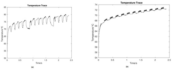 During our work, we considered two important metrics: bit error rate and power consumption. In our proposed countermeasure, it can be difficult for the attackers to identify or guess the temperature signal pattern, so the sensitive information cannot easily leak. Consider that a system has a thermal covert channel with a transmission frequency of 100 Hz. Figure 5 shows the temperature signal without and with the proposed countermeasure. As Figure 5b illustrates, when the proposed countermeasure is applied, it shows a significantly different thermal profile.