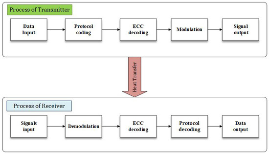 The components and signal flow of a communication system through a thermal covert channel, from the transmitter to the receiver.