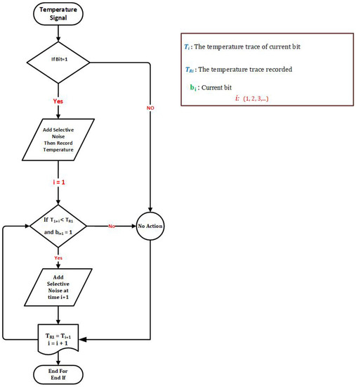- Step 2 (Temperature monitoring of processors and adding selective noise): In the last step, the next bit’s temperature is compared with the recorded temperature (TR) from the previous step. If the temperature of the current bit is less than TR or starting to decrease, the selective noise is added to keep the temperature at the same level, otherwise it is moved to the next bit. This progress continues until the end of the transmission process.