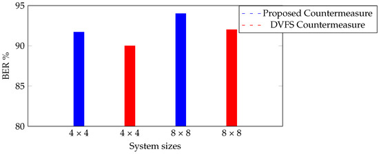 Figure 8 shows that the average BER’s of our proposed countermeasure is always higher than that of the DVFS countermeasure for different system sizes.