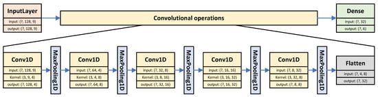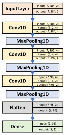 The ‘big’ network is the same as the one introduced in the previous configuration, while the secondary ‘dual’ network has been reconstructed as shown in Figure 9 and Table 3. In the same way as for the ‘little’ network, the single input data from the total accelerometer sensor are selected for the ‘dual’ network. Therefore, the input data shape of the ‘dual’ network becomes (1, 128, 3, 2), which contains two adjacent input data samples. As there is a significant increase in the input data shape, the number of parameters increases from 184 in the ‘little’ network to 300 in the ‘dual’ network.
