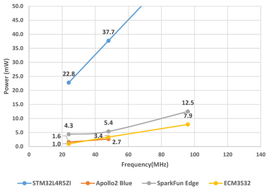 Figure 4 indicates the energy consumption values observed using the X-NUCLEO-LPM01A energy measurement board. Since the power consumption of the standard MCU STM32L4 in Figure 2 is six times higher compared to the near-threshold MCUs and there is no obvious advantage in processing speed at the same frequency, STM32L4 is the worst device in terms of energy consumption for all operating frequencies from 24 to 96 MHz. SparkFun Edge (Apollo3) is slightly higher than Apollo2 at 24 and 48 MHz due to the energy consumed by the peripheral equipment on board. ECM3532 achieves the minimum energy consumption at normal frequency points (24 and 48 MHz) in the energy test because it has better results in both power and time evaluations. However, when operating in the 96 MHz burst mode, ECM3532 requires more power to obtain a higher processing speed, resulting in a slight increase in energy consumption, and the same situation can be seen for the SparkFun Edge board.