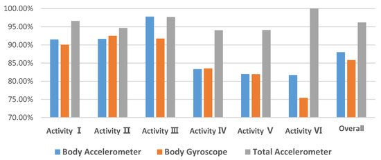 The UCI-HAR data set uses a body accelerometer, body gyroscope, and total accelerometer with three axes to provide body information for six actions (SITTING, STANDING, LAYING, WALKING, WALKING_UPSTAIRS, and WALKING_DOWNSTAIRS) performed by a group of 30 volunteers. All the data have been sampled in fixed-width sliding windows of 128 sampling points and they have been randomly partitioned into two sets, with 70% of data samples used for training and 30% used for testing. Therefore, we have a training data shape of (7352, 128, 3, 3), and a testing data shape of (2947, 128, 3, 3). We have evaluated the accuracy as shown in Figure 5 by applying the test data from these three sensors to the secondary network. The total accelerometer sensor shows the best overall accuracy. Thus, this sensor is selected for the secondary network inference. The training and testing data sets from UCI-HAR use floating-point values with a wide range so that before training the model, all the data have been rescaled to quantized integer values with a range of [—128, 127]. In the following sections, these actions are referred to as follows: