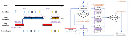 The main idea is to deploy an adaptive system that consists of one ‘big’ (output of six classes) and six ‘little’ (output of two classes for each) network models in the MCU devices. As shown in Figure 6, once the ‘big’ network provides a category and stores it in the register, the corresponding ‘little’ network will be triggered to infer the next incoming activity. The ‘little’ network is responsible for detecting whether this current activity belongs to the previous category provided by the ‘big’ network. For example, after the first activity is detected as SITTING by triggering the ‘big’ network, the second incoming activity data will be processed by the ‘little’ network, which is able to distinguish whether the second one is still SITTING or not. Once the next incoming activity is not SITTING anymore, the ‘big’ network will be switched back on again. Otherwise, the ‘little’ network remains active to save power and inference time. Therefore, we have six ‘little’ networks which are equal to the number of categories classified in the ‘big’ network.