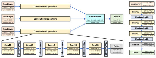 Figure 7 shows the model topologies for both ‘big’ and ‘little’ networks, while Table 2 shows the parameter details of the network layers. Since we are using all three sensors’ data from the UCI-HAR data set to classify six activities, the ‘big’ network has three inputs, resulting in around 9000 parameters in total. Convolutional 1D layers and max-pooling layers from Keras are stacked together to form the three ‘big’ branches in Figure 7. Then, the outputs from these branches are converged by a concatenate layer followed by a dense layer that has six neurons for six categories. The data shape of each sensor is (7352, 128, 3) which means we have 7352 data samples with a length of 128 for each axis. The data set is labelled from 0 to 5 to represent each activity for the training and testing processes in the ‘big’ network.