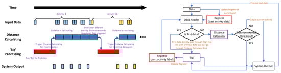 Finally, we consider whether the wake-up module in the adaptive system can be replaced by a simpler algorithm instead of using neural networks such as ‘little’ and ‘dual’ networks. This configuration, which is similar to the second configuration, replaces the ‘dual’ network model with a distance calculator measuring the difference in the distance between two adjacent input samples. In order to pick up on an activity change, a distance calculator using Minkowski distance and Mahalanobis distance is applied to trigger the ‘big’ network when the difference in distance reaches a pre-set threshold value as shown in Figure 10.