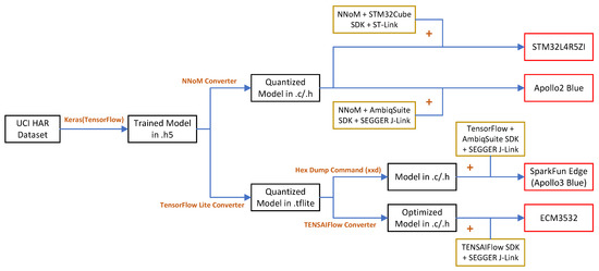 The map of the steps of neural network model deployment on target MCU boards. Black frames represent trained models, brown frames represent the library source codes used, while red ones represent MCU boards.