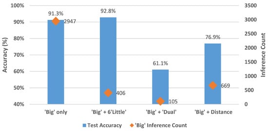 In Figure 13, the ‘big’-only configuration has 91.3% accuracy but the model has a large invocation count that will result in significant latency. The ‘big’ + six ‘little’ configuration reaches a comparable level of accuracy and the number of times the ‘big’ model invoked is reduced from 2947 to 406, reducing the inference time of the ‘big’ model by two-thirds. The ‘big’ + ‘dual’ configuration cannot reach a similar accuracy due to the low accuracy of the secondary ‘dual’ network. The ‘big’ + distance configuration achieves a relatively low testing accuracy and it invokes the ‘big’ network 669 times in 2947 data samples.