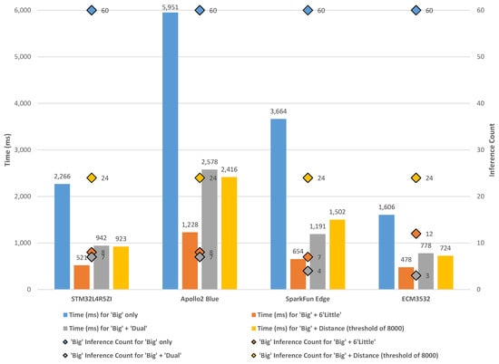 The difference between the inference time of the ‘big’-only and ‘big’ + six ‘little’ configurations is shown in Figure 14. The inference latency of the ‘big’ model is around 12 times longer than the latency of the ‘little’ model. Therefore, the lower the number of times the ‘big’ network gets invoked, the higher the efficiency of the system is. In this configuration, six ‘little’ models are applied to save time by restricting the ‘big’ inference count to around ten times. In all MCU evaluations in Figure 14, the time result of the ‘big’ + six ‘little’ configuration is the lowest and this reduces the execution time by around 80% compared to the original ‘big’-only configuration and around 50% compared to the others. For all four configurations, the power is largely equivalent, as can be seen in Figure 15. Due to the significant advantage of the ‘big’ + six ‘little’ configuration in terms of execution time, this configuration achieves energy savings of around 80% compared to the original ‘big’ method on all MCUs.