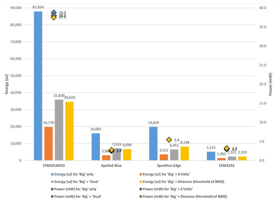 Overall and across all MCUs, our best adaptive network configuration, the ‘big’ + six ‘little’ configuration, achieves a high prediction accuracy level of around 90%, which is comparable to the original ‘big’-only method. As discussed in Section 3’s initial evaluation of the MCU, ECM3532 achieves the highest processing speed, followed by STM32L4, SparkFun Edge (Apollo3) and Apollo2 (listed fastest to slowest). With the same configuration, the execution time in Figure 14 shows that this is consistent across all four MCU boards. For the ‘big’ + six ‘little’ configuration, the ‘big’ inference count is reduced by around 85% compared with the original method, achieving up to the acceleration on MCUs. Since the MCU boards are in working mode when running different configurations, the power consumption of these configurations is similar to the MCU shown in Figure 15. Due to the negligible differences between network configurations in terms of power, the distribution of the energy consumption of the configurations for each MCU follows the time cost distribution in Figure 14. As shown in Figure 15, across all devices, the ‘big’ + six ‘little’ algorithm configuration achieves energy savings of around 80% compared to the original ‘big’-only method, and around 50% compared to the other two configurations. Furthermore, compared to a standard MCU running the ‘big’ network only, the best configuration, the ‘big’ + six ‘little’ model, coupled with the best state-of-the-art near-threshold hardware, can achieve a reduction in energy of up to 98% that will translate into a increase in the operating lifetime of an application for detecting battery-powered activity.