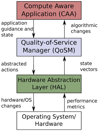 We define compute-aware applications (CAAs) as programs which meet two needs of controllability, namely, the ability to change algorithms dynamically and to provide a progress or performance metric. CAAs can be composed with their individual controls and outputs shared with the QoSM. The CAA state is continuously monitored by the QoSM. This state consists of both metrics (e.g., latency, error) and application guidance to the hardware. Most importantly, the QoSM does not have to understand the meaning of a specific metric or guidance is, it is only required to integrate it into a state vector or feature reduced state. While we do not attempt feature reduction in this work, it has been effective for modeling and prediction in GPUs [55] and CPUs [56]. The QoSM takes this state vector and uses a policy—or set of policies—to take an action. Again, this action does not have to be understood by the QoSM, it is only required to observe the outcome. As an analogy, the QoSM turns an unlabeled knob, and then observes the reward obtained from its action. The actions are then converted by a hardware abstraction layer (HAL) into low-level platform-specific hardware or operating system changes.