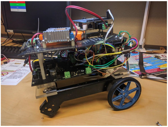The autonomous robot is based upon the DF Robot Cherokey 4WD [62]; however, it has been significantly modified. The robot can be seen in Figure 2. Aside from physical modifications, the computational system has been split, creating a custom, stacked heterogeneous architecture, consisting of two separate computational units: an Arduino ROMEO BLE ATMega328/P [63] and an ODROID XU4 [64].