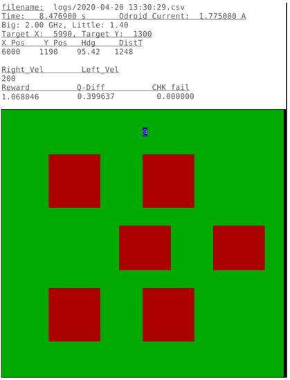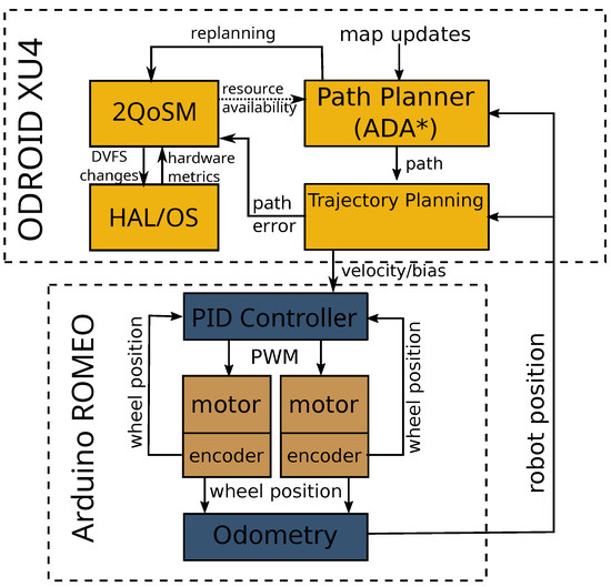 This data is used by the ODROID XU4 for mapping, route planning and trajectory planning. The ODROID XU4 is build around a Samsung Exynos5422, an ARM big.LITTLE processor. The XU3 and XU4 are very similar and have been used extensively as a test platform in previous research into intelligent power management [39,43,44,45,53,65]. The ARM big.LITTLE heterogeneous multiprocessing architecture (HMP) consists of two clusters of cores: four high performance, higher-power Cortex-A15 cores and four lower-performance, lower-power Cortex-A7 cores. DVFS operates on a per-cluster granularity [66] and threads are scheduled automatically between the two types of cores [67]. The default scheduler is used in this research; however, using the 2QoSM to schedule threads on cores (as an available action) is possible in future research. It runs a stock version of Ubuntu Linux 18.04 with kernel v4.14.5-92. The details of the platform are summarized in Table 1.