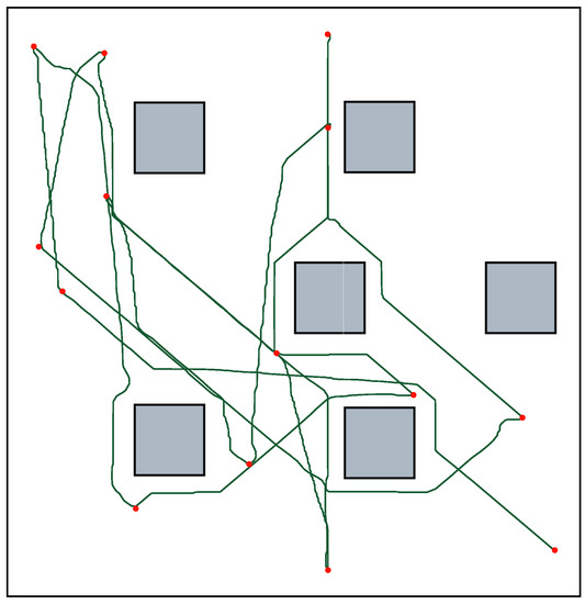 During the 600 s training phase, the robot traversed to randomly selected points on a map with 6 obstacles. The red dots represent the target points.