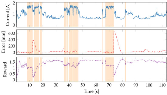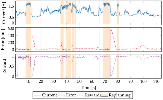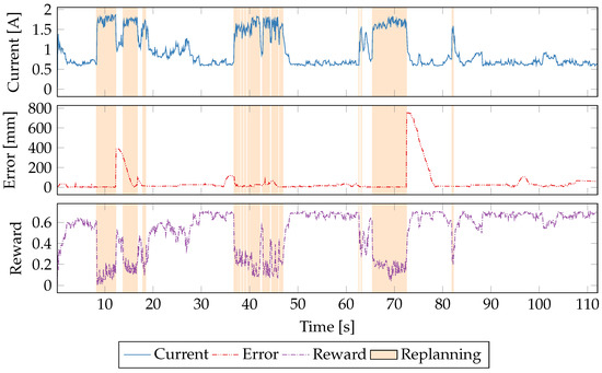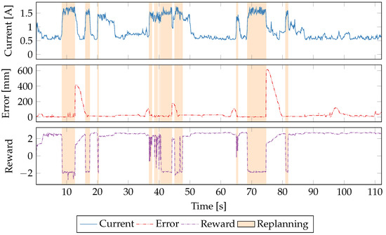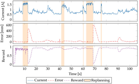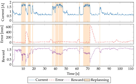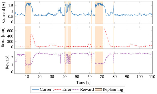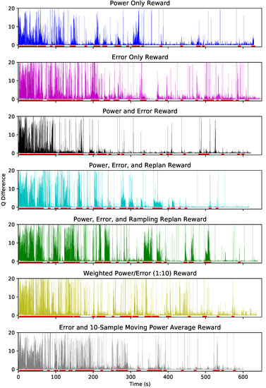 Figure 6 shows the updates to the Q-matrix at each sample time for seven different reward functions described in Table 4. The absolute value of the update to Q-values are shown on each y-axis, and the training time is shown on the x-axis. Periods when the robot is replanning its path are indicated by red bars underneath each plot. Over the 600 s of learning the magnitudes of Q-updates decrease as the policy converges. The error-only reward function is the least convergent due to the difficult-to-predict relationship between CPU power consumption and robot path-following. We see similar difficulties in convergence when error is weighted more heavily as in the 6th reward function (weighted error/power).