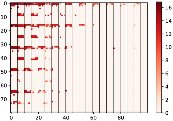 This figure shows the distribution and magnitude of updates in the Q-matrix. Darker colors show a higher measured future reward Q while the lightest values generally show state–action pairs that were never reached.