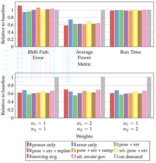 The power-only reward function reduces power consumption by 2.98 W (42.6%) compared to the on-demand governor and 0.457 W (10.2%) compared to the situation-aware governor. RMS error is minimized using an error-only reward function, showing a 6.1% improvement over on-demand and 8.9% over the situation-aware governor. This is an interesting result, since previous work had shown that the on-demand error was very close to a static high-power setting. The most likely explanation is that the proactive application guidance during replanning mode proactively prepares for computationally-intensive regions better than the reactive power management of on-demand. This is because while on-demand keeps average power high because of the fairly active application (trajectory planning, communications, etc.); however, it still attempts to adjust P-states, finding itself in a less-than-optimal performance state when activity spikes. The reward function that sums power and error lowers power consumption in comparison to the Linux on-demand governor by 2.703 W (38.7%) and to the situation-aware governor by 0.18 W (4.0%). We also see an improvement in error over on-demand and situation-aware governors by 4.6% and 7.49% respectively.
